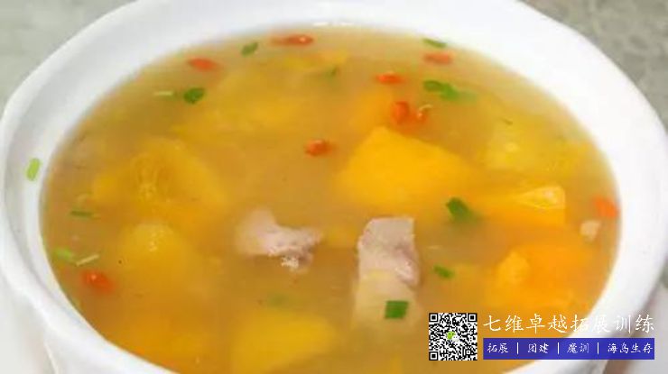 萬壽果雞湯:與一般的木瓜湯有所不同,這煲湯看起來更像木瓜羹,打爛(làn)的木瓜茸與(yǔ)湯水融為(wéi)一體,呈現亮麗的橙色,吃來特別清甜。