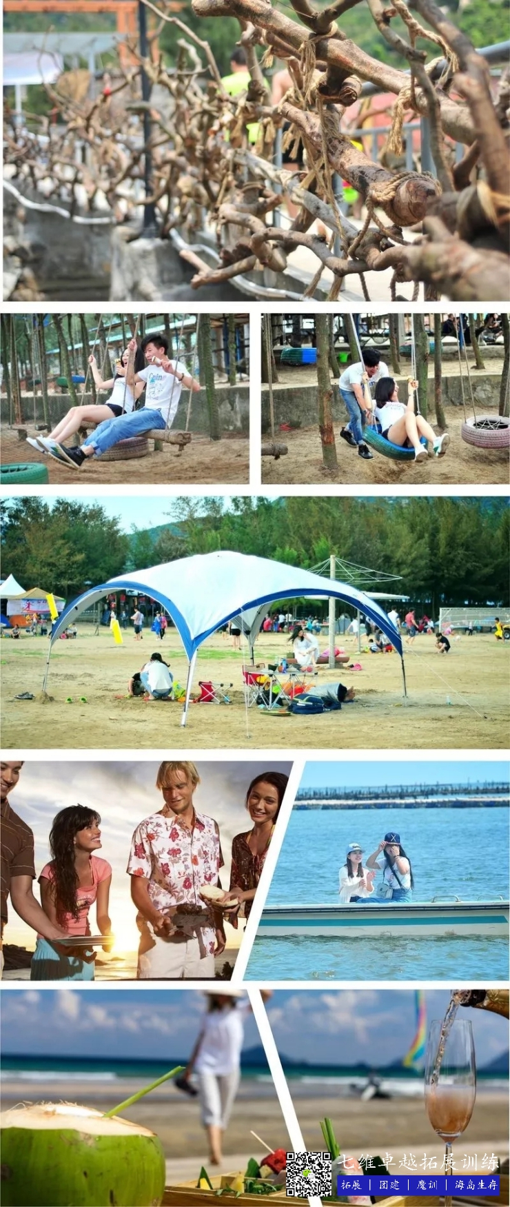 基地內休閑:沙灘戲水、恒溫泳池、捕魚、挖螃蟹、海釣、網床、足球區、排球區、羽(yǔ)毛球、拔河區、登山、許願區。