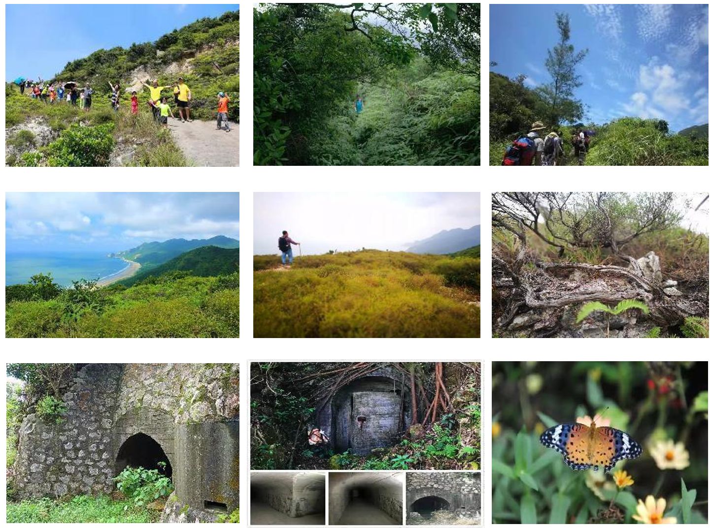 環(huán)山穿越(yuè)徒步線路(lù)總長大概5公裏(lǐ),穿行時間約2.5小時,途中穿越蝴蝶穀、神秘沙丘、葬(zàng)帝山、紅曇林區、香鬆園、綠色(sè)長廊、南海前哨、防空洞等景點。建(jiàn)議穿越驢友穿長衣長褲、帶足夠的水和幹糧。
