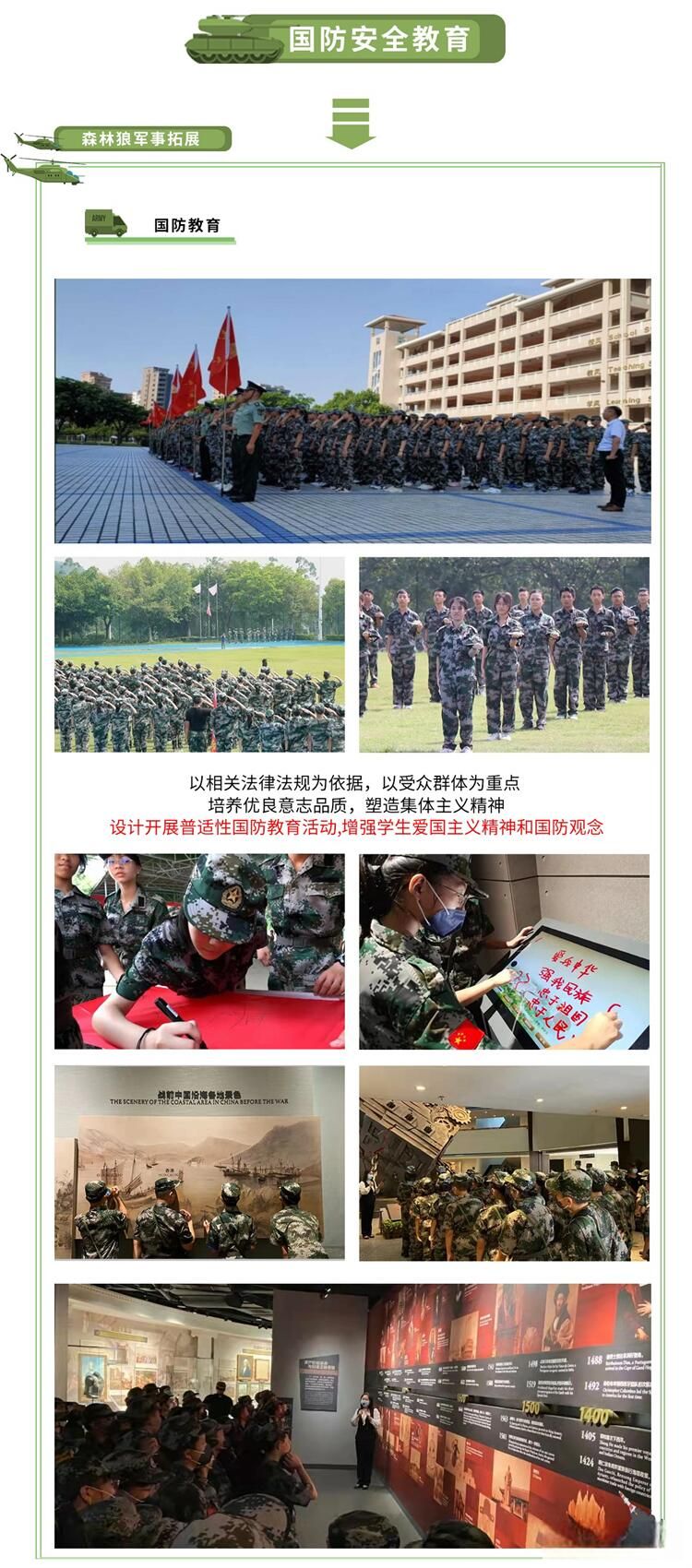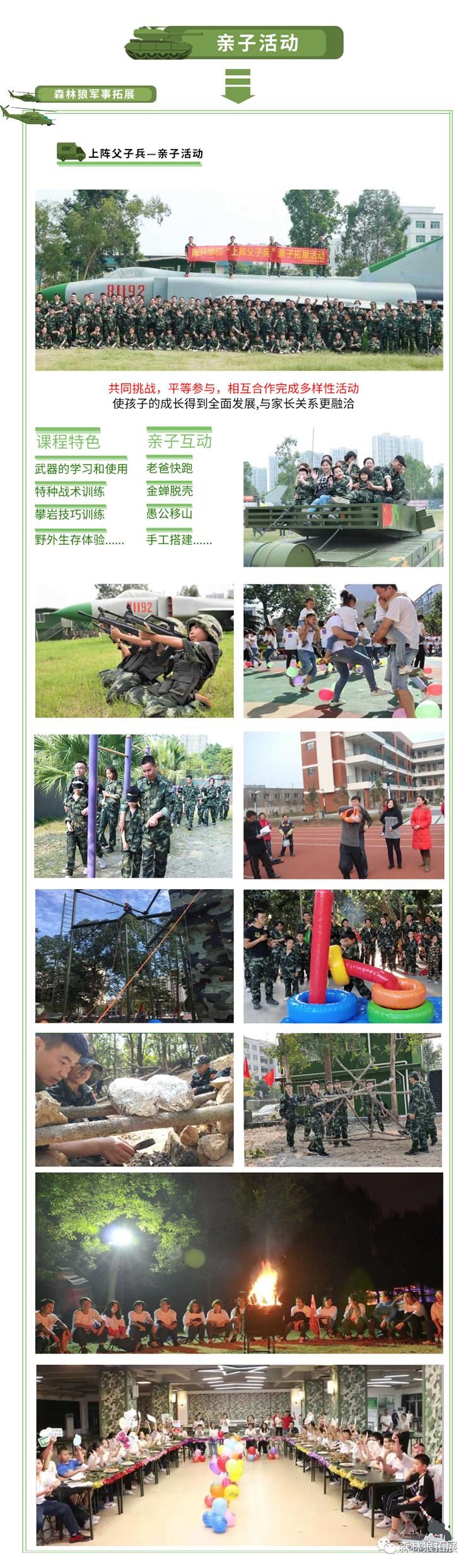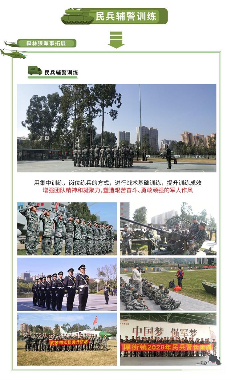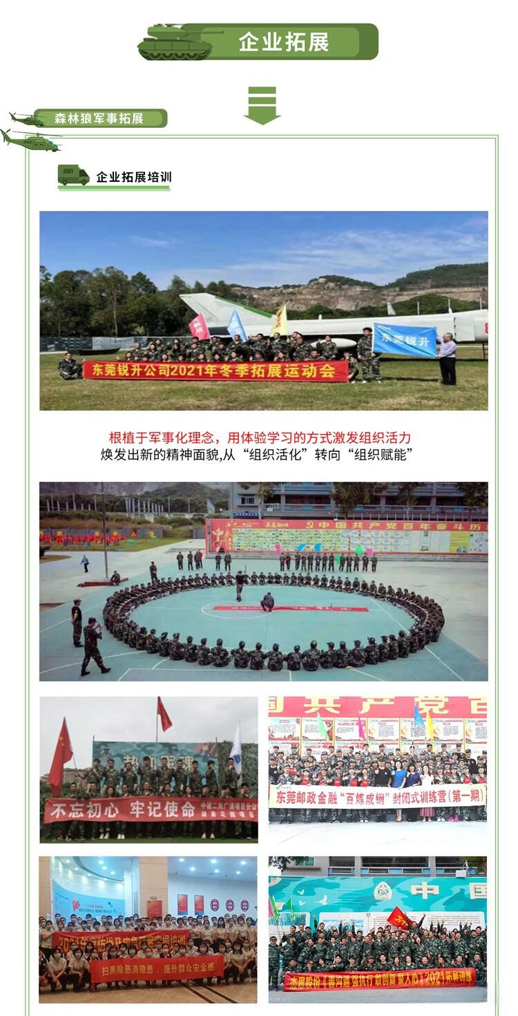 東莞市森林狼軍事基(jī)地位於東莞市常(cháng)平鎮。經(jīng)營範圍包括:中小學生社會 實踐、軍訓、軍事夏令營(冬令營)、遊(yóu)學、研學、民兵訓練、企業www.17c、親(qīn)子拓(tuò)展、 安全培訓、反恐培訓(xùn),大型體育(yù)賽事、大型活動的組織和安保服務等。