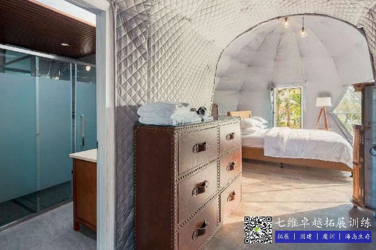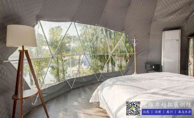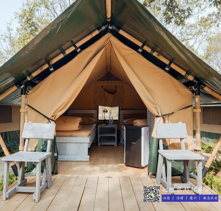 特點:公共洗漱間緊鄰(lín)帳篷,極為方便,並且床鋪、衣櫃到椅凳、空調、充電頭等生活必(bì)須品(pǐn)均一應俱全。