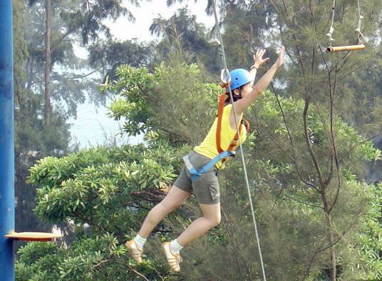 另外一個有挑戰的是項目是空中抓杠,空中抓杠要爬山並站立在一個9米多高的圓柱上,站在(zài)一個頂端微晃(huǎng)的圓盤上,站立起來之後就可以看到(dào)前方有一根單杠,需要跳躍出(chū)去(qù)並抓住單杠就算成功完成挑戰,這是一個挑戰自我極限(xiàn)的(de)www.17c項目。輪到我的時候,我克服內心恐懼爬山(shān)圓柱,當搖(yáo)搖晃晃的站上圓盤後,才發現站的位置確實很高,眼前的單杠顯得很遠,雖然係(xì)著承重至少2噸的動力(lì)繩,內心的恐懼讓我有些猶豫不定。雖然下麵的夥伴們在努力(lì)鼓勵我,跳吧(ba),你可以成功的。他們(men)的鼓勵讓我鼓足勇氣,盯著眼前的單杠,內心在不斷自我(wǒ)激勵,慢慢的我蹲下來,縱身跳了出去,順利抓(zhuā)住了(le)單杠,成功了,我終於成功克(kè)服自己內心的恐(kǒng)懼(jù)。當從高空降落下(xià)時,心裏輕鬆極了。人最大的障礙就是自己,戰勝了自己是取得成功的(de)必要(yào)條件。隻要你克服了恐懼,實現自(zì)我(wǒ)超越,即使你沒有抓住單杠,你依然是成功的,人生很短,不(bú)去放手搏,不去嚐試,最終剩下的隻(zhī)能是遺(yí)憾。