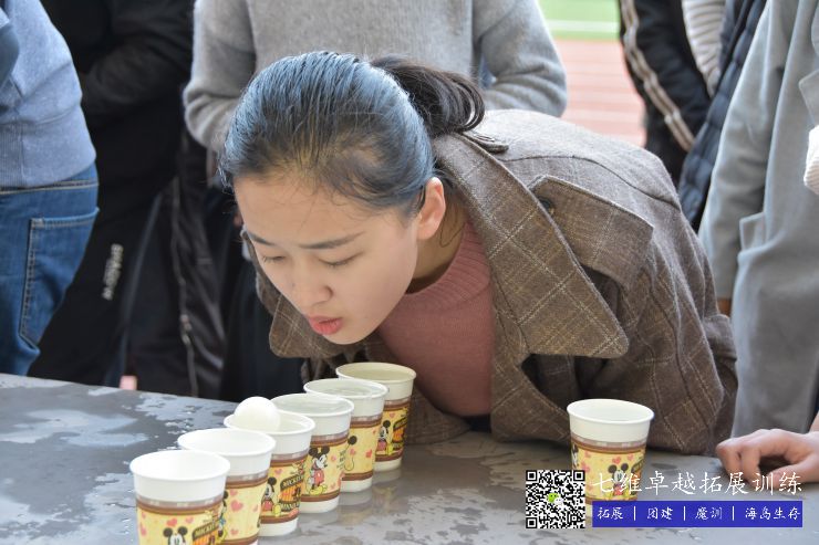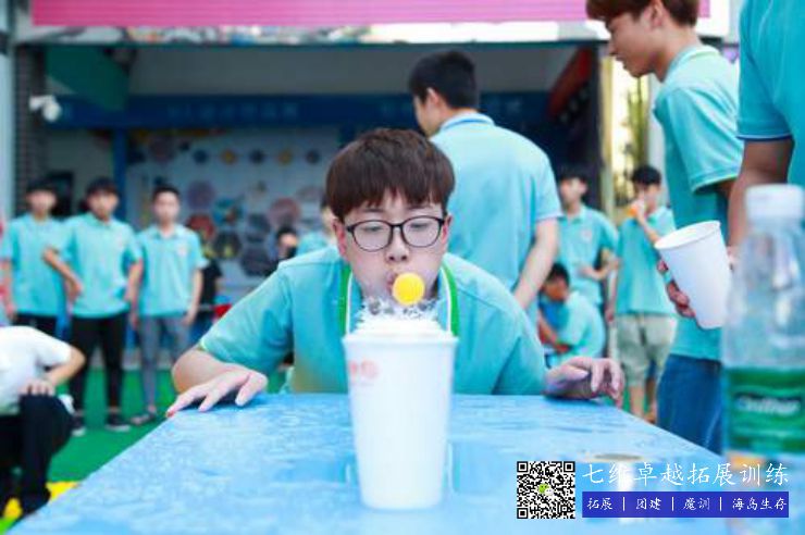 5個紙杯中裝滿水挨著放好,氣球放在第一個杯子上,成員隻能用嘴吹的狀態下,從第一個吹到最後一個杯子裏麵