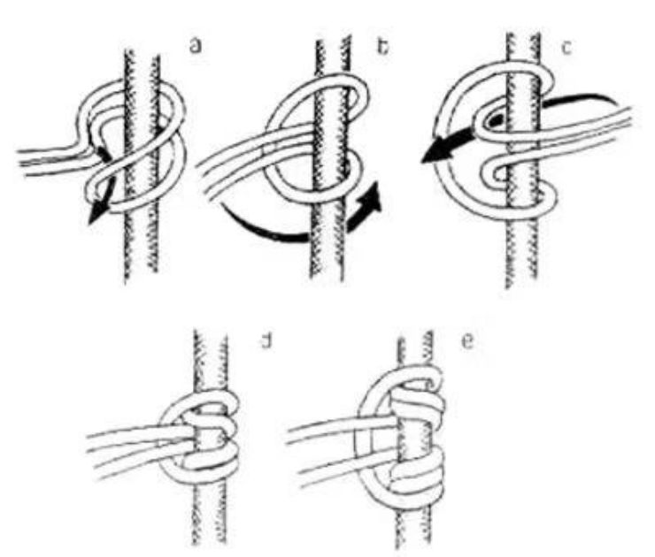 7、雙套(tào)結(clove hitch):用於(yú)特(tè)定攀登技術中的一種結,也可做固定用。