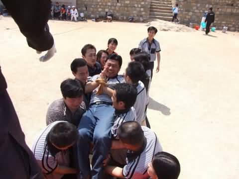教練的一聲哨聲下,團隊中強壯的男人甘當人梯,所有人共同努力,團結合作,我們