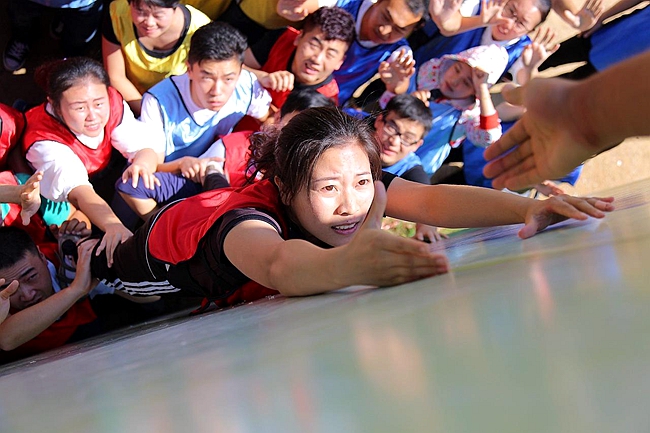 畢業牆這個項目,使(shǐ)我感覺到“翻越求生牆”訓練是對我們意誌的考驗,4米高的筆(bǐ)直的鐵牆,沒有任何工具,當時就想著怎麽過去?大家齊心協力共同努力,終(zhōng)於征服了“求生牆”,但是更讓我無(wú)法忘懷(huái)的是(shì)作為人梯底座的隊員不(bú)知肩上、身上受了多(duō)少“踐踏”,更讓人(rén)敬佩的是為(wéi)了幫助最後一名隊(duì)員順(shùn)利攀上畢業牆(qiáng),取得(dé)最終勝利的隊員,使同舟共濟的團隊精神得到了最好的升華。在最後教練(liàn)讓當人梯的隊(duì)員站成一排,當我們看到充當人梯(tī)的隊員肩膀上都是血印的時候,眼淚不經意的(de)流了下來。
