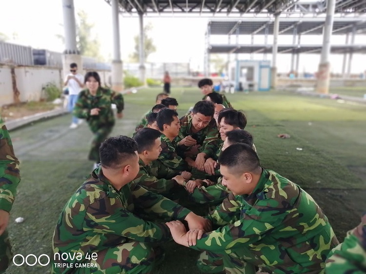 全體隊員排(pái)成兩排,他們在中(zhōng)間匍匐前進,每爬(pá)一(yī)步便呐喊(hǎn)一句(jù):“拜托了,請認真一點!”
